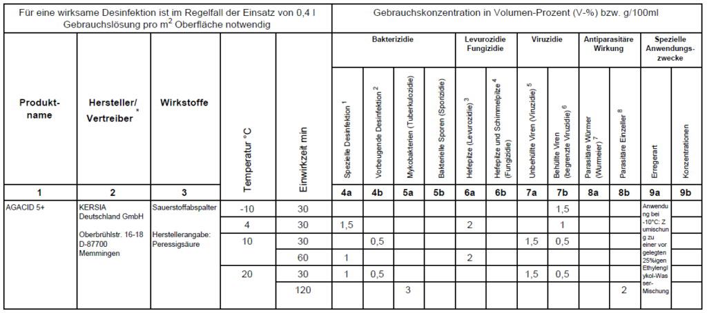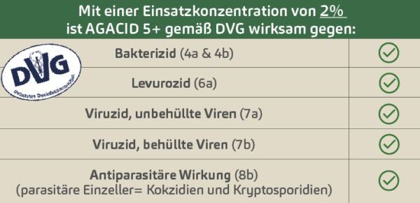 Agacid 5+ ist ein saures, flüssiges, hochstabilisiertes Schaumdesinfektionsmittel auf Basis von Peressigsäure mit einer kombinierten bakteriziden, viruziden, levuroziden und antiparasitären Wirkung gegen parasitäre Einzeller (Kokzidien und Kryptosporidien), welche von der DVG mit einer 2%igen Einsatzkonzentration bestätigt ist.